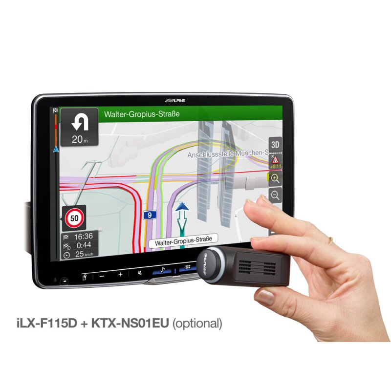 Der separat erhältliche Bedienknopf RUE-BK01 verbindet sich drahtlos mit dem Alpine Halo 11 und kann links oder rechts neben dem Touchscreen angebracht werden. Alternativ lässt sich der Bedienknopf auch an einer anderen Stelle im Fahrzeug platzieren. Drehen regelt die Lautstärke der Headunit, Drücken aktiviert die Rückfahrkamera auf dem Bildschirm.