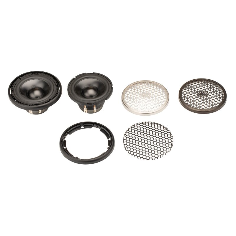 OEM-Gitter (wahlweise in silber gebürstet oder schwarz verchromt), die dem Lautsprecher eine elegante, fast unauffällige Optik verleihen und sich perfekt in die Innenausstattung eines Fahrzeugs integrieren lassen.